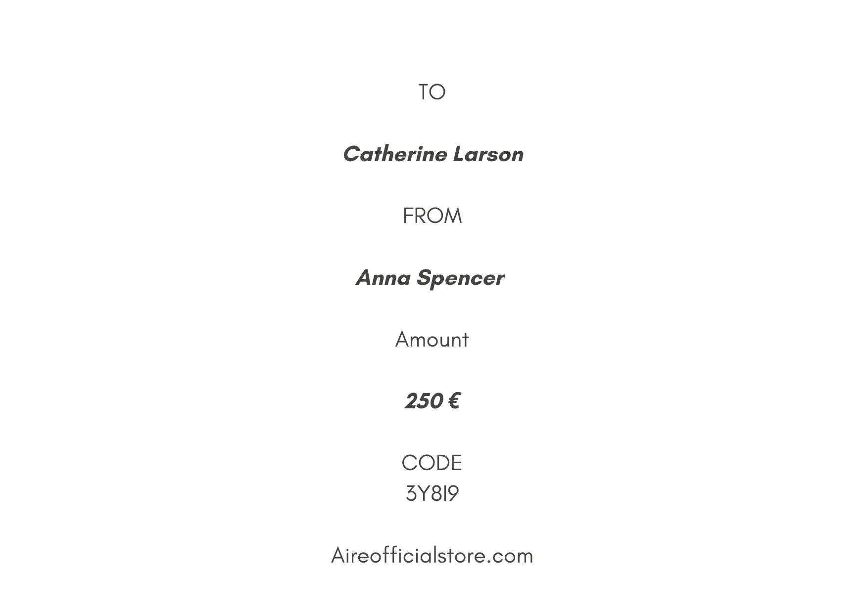 The Gift Card will be delivered directly via email. If you wish to gift it to someone, you can send their details at info@aireofficialstore.com, ensuring they receive the card directly in their mailbox. Alternatively, it will be sent to your email, allowing you the option to transfer it to a person of your choosing later on.