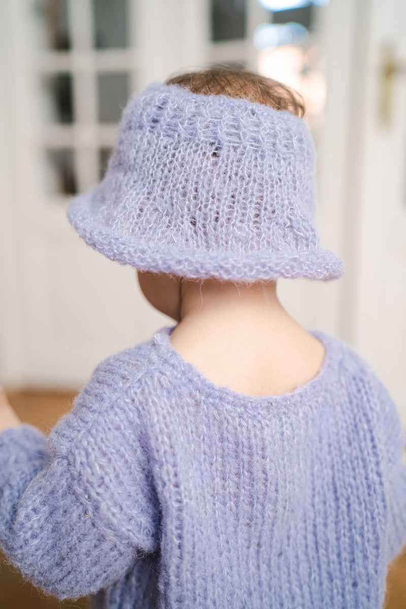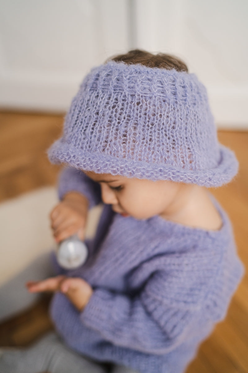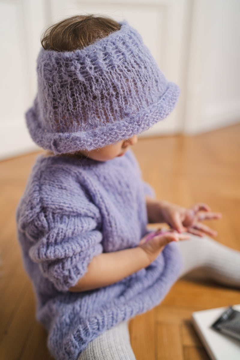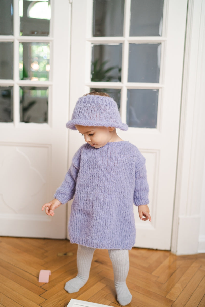 A fabulous lavender set featuring a silky hat and a long sleeved dress with a crew neck and a slightly loose fit.