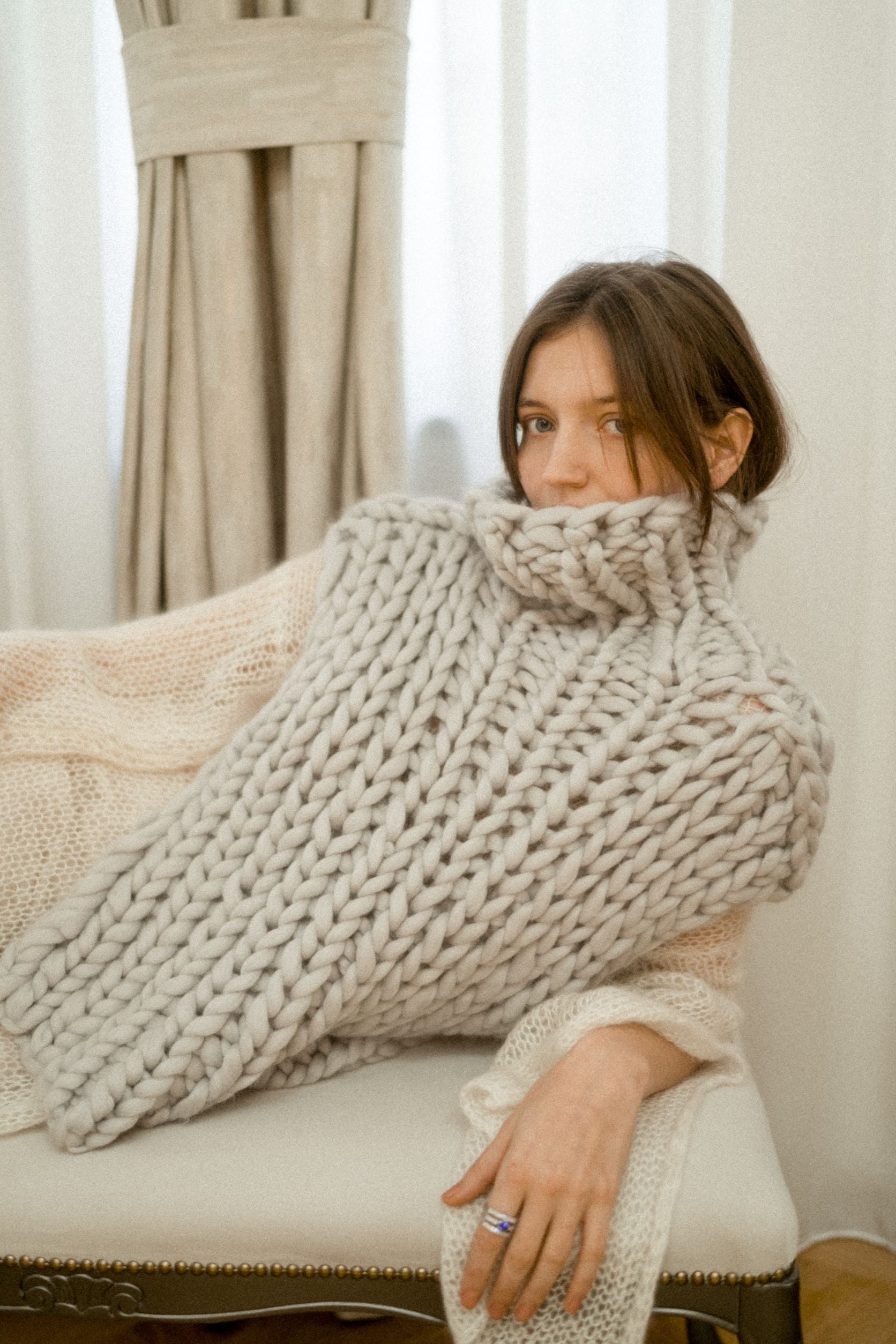 Turtleneck top knitted from soft organic merino wool, designed with a cape-like silhouette that gently hugs the body, creating volume and movement. Layer it over a dress for a feminine styling.