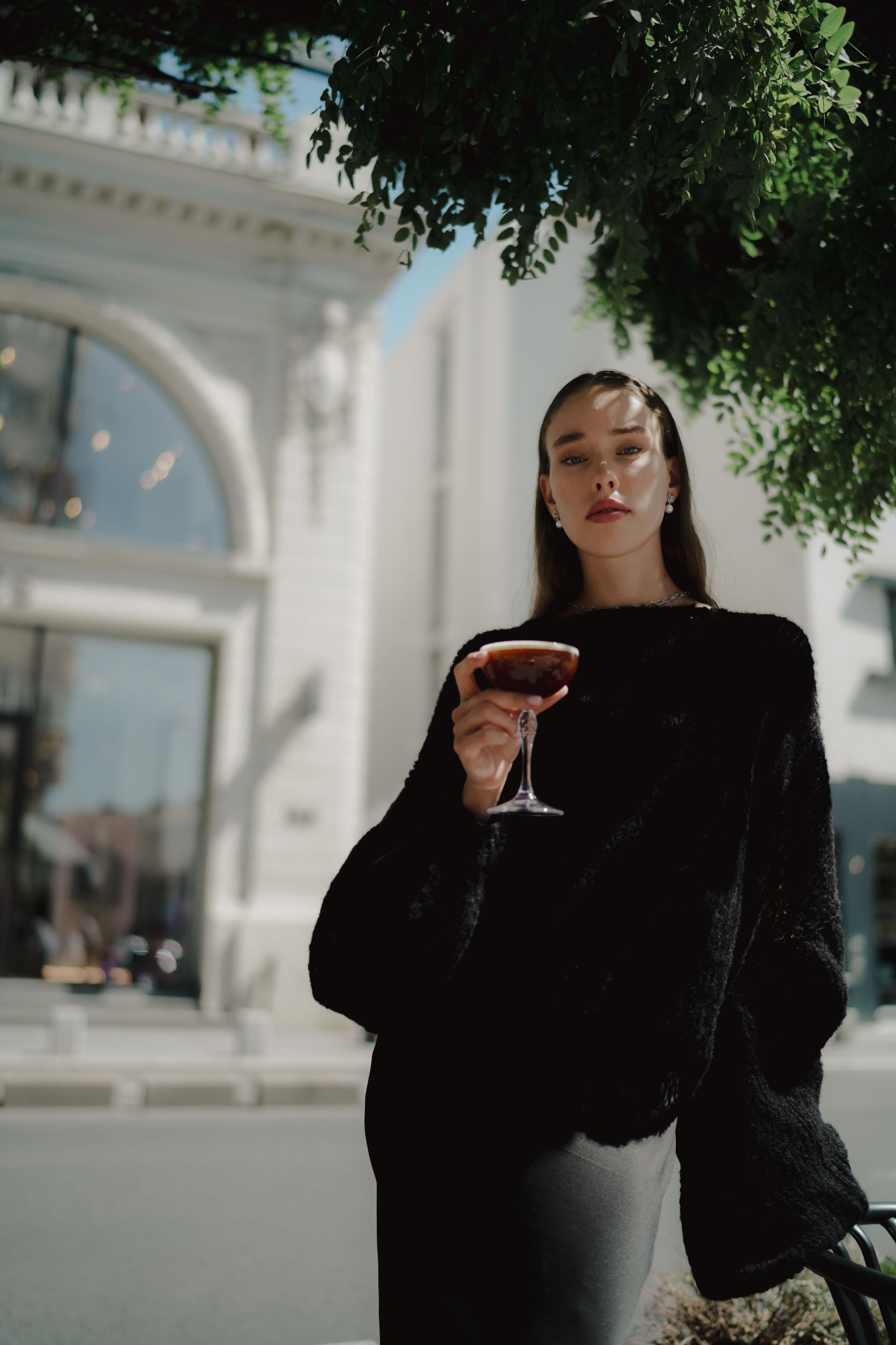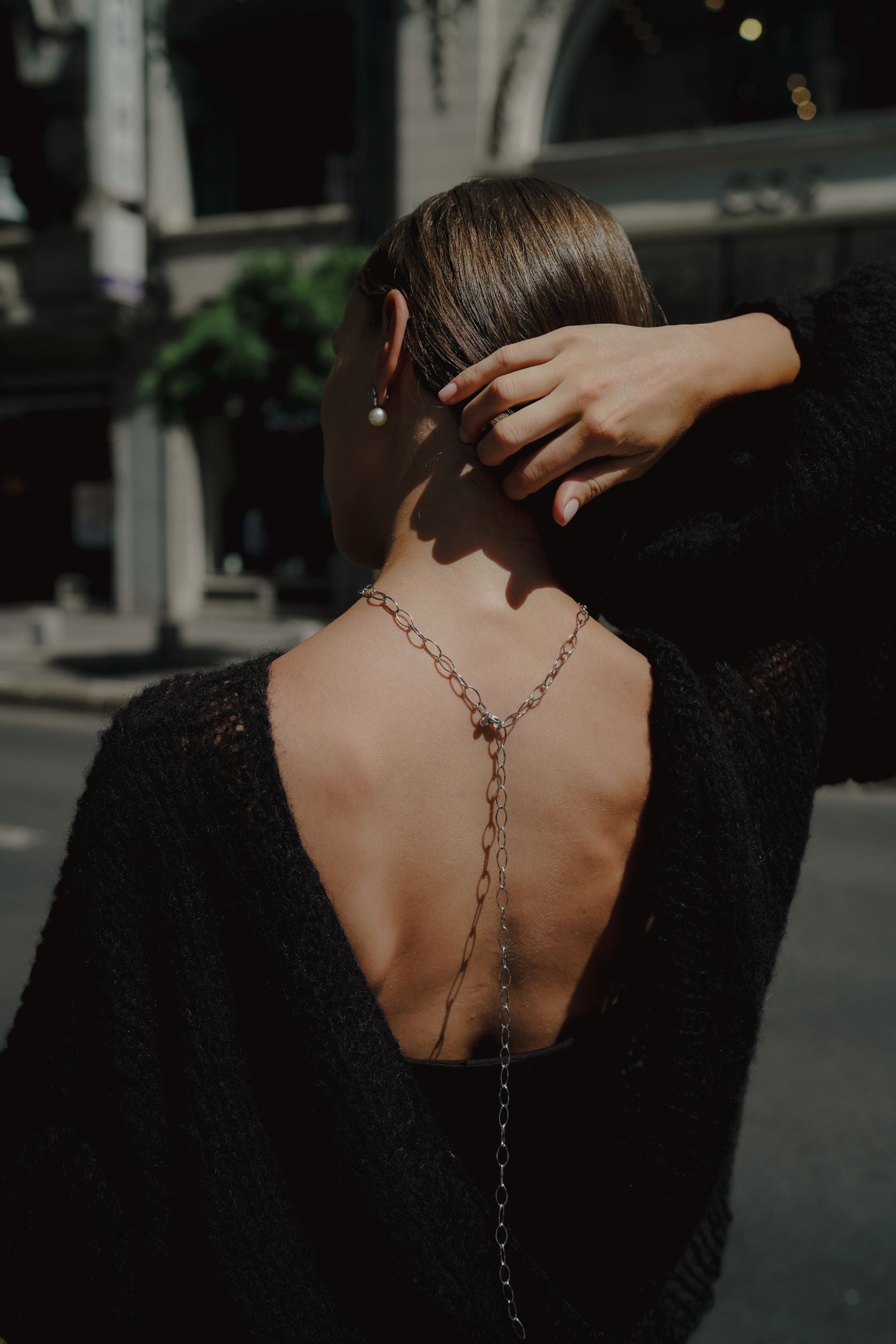 Oversized cardigan in extra fine alpaca, with voluminous long-sleeves, a V-neck opening and a detachable pearl accessory for fastening. Designed to be worn both ways: backless or as an open front cardigan.