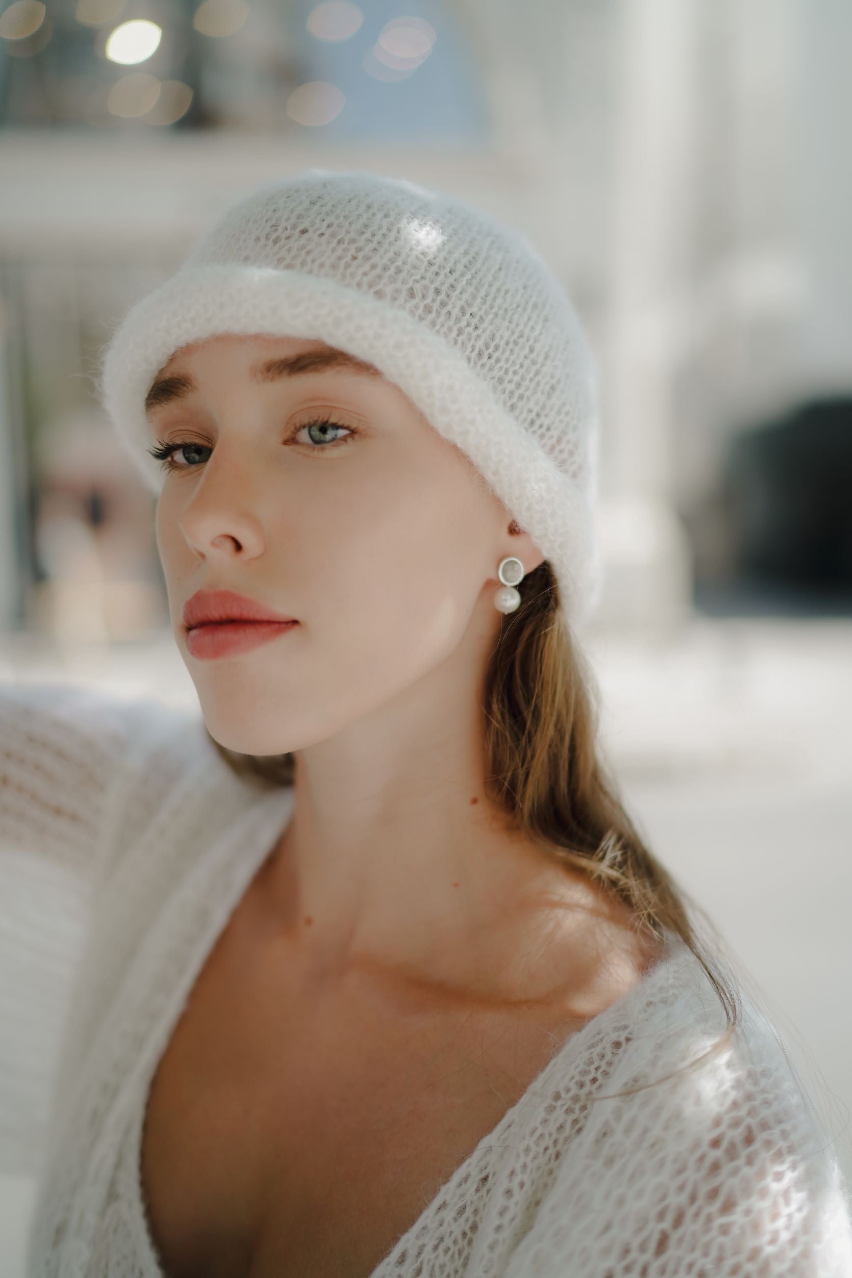 Relaxed beanie in soft lightweight mohair and silk with an rolled-edge finish.