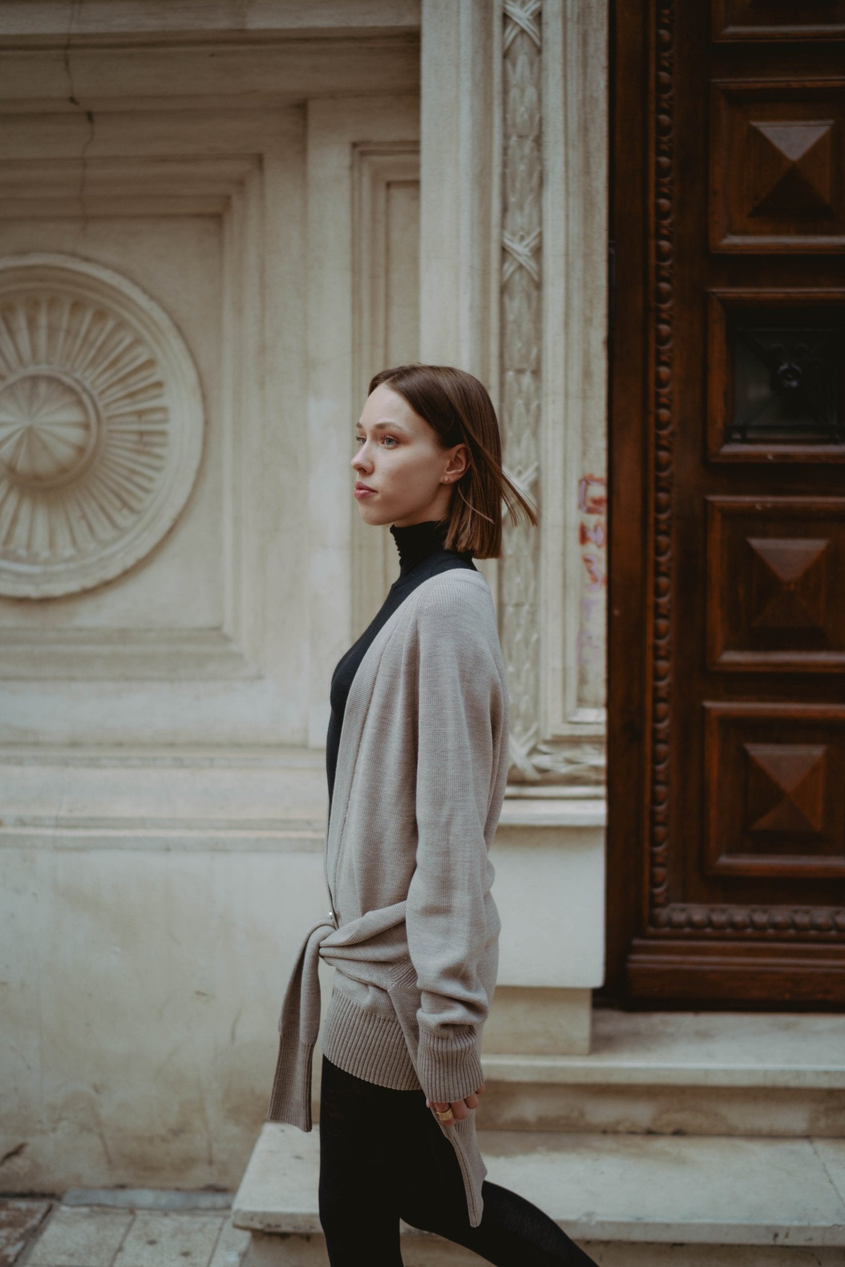 Deep V-neck AIRE cardigan finely knitted from smooth Merino wool fibers for a light sensation. It has a flattering shape fastening along the front with high-quality metallic buttons. The slim silhouette is balanced by relaxed, extended sleeves with high ribbed hems. Wear it on weekdays and weekends with a basic jumpsuit or over a maxi dress for a social event.