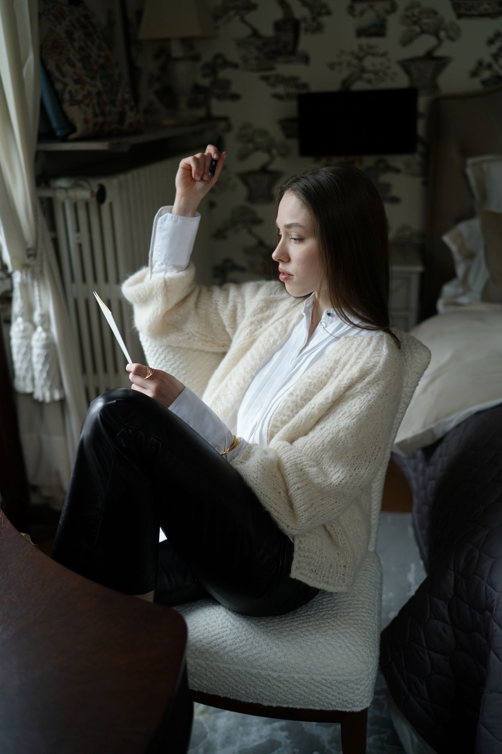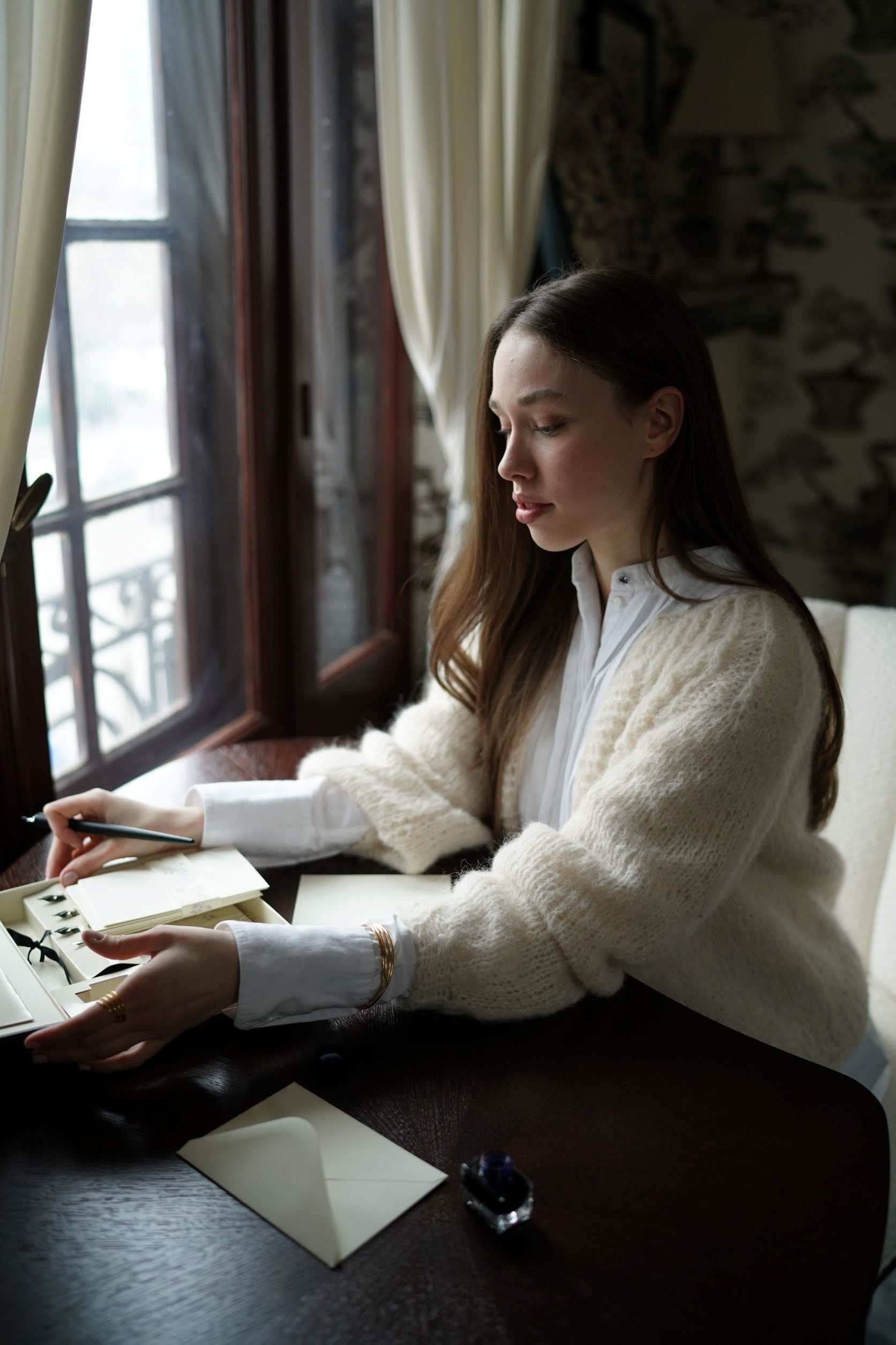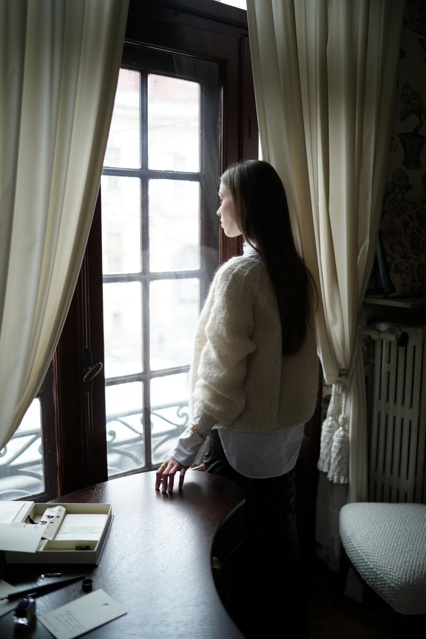 A luxurious cream cardigan, crafted by hand from soft mohair and pure silk with a slightly loose cut and feminine neck details.